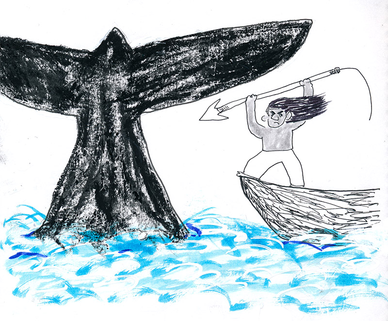 長かったクジラのうんちく話が終わり、乗組員たちの退屈な説明もようやく終わりました。海に出てから急に文章が難解になってきて、ぼくは何度も遭難しかけました。しかしついに、クジラと戦う場面がやってきた!クジラの群れを見つけるやいなや、3隻のボートで追跡します。手漕ぎです。あっさりとボートは転覆し、あやうく死にかけます。ワクワクするシーンのはずなのに、メルヴィルの文章が詩的で難解だから、面白さよりも、「難しい」が先に来ます。
