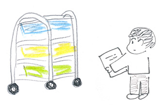 古道具屋で売られていた、シルバーフレームにカラフルなトレイの付いた収納ワゴンが、我が家にやってきた。子供がリビングにまき散らしていた、プリント、えんぴつ、折り紙、UNO、何かの説明書、そんなモノたちを収納した。いいかんじ。
