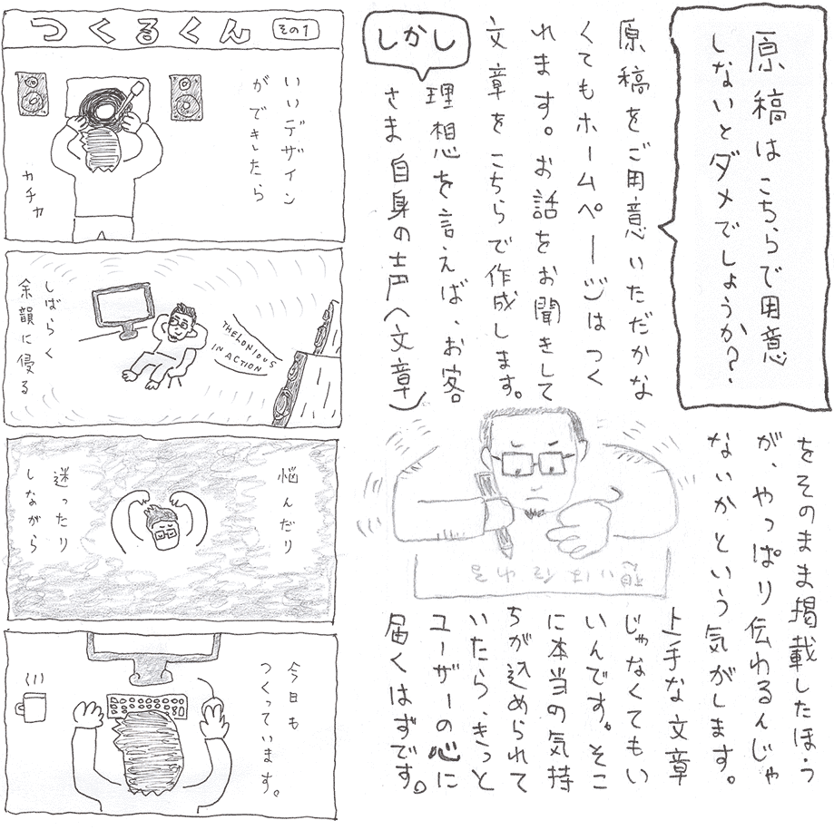 はい、すべてぼくひとりでつくります。打ち合わせ、原稿書き、デザイン、コーディング、すべて原田が責任を持って担当します。自分で聞いて自分でつくるので、お客さまのイメージやご要望をダイレクトに反映できます。また、案件ごとに品質が異なるようなこともありません。